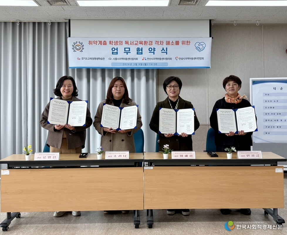 경기도교육청평생학습관(관장 류영신)은 9일 평생학습관에서 시흥시지역아동센터협의회, 안산시지역아동센터협의회, 안성시지역아동센터연합회와 취약계층 학생의 독서·교육환경 개선을 위한 업무협약을 체결했다. 협약식에는 류영신 관장을 비롯해 각 지역아동센터 협의회 및 연합회 관계자들이 참석해 지역 간 교육격차 해소와 독서문화 확산을 위한 공동 협력을 약속했다.