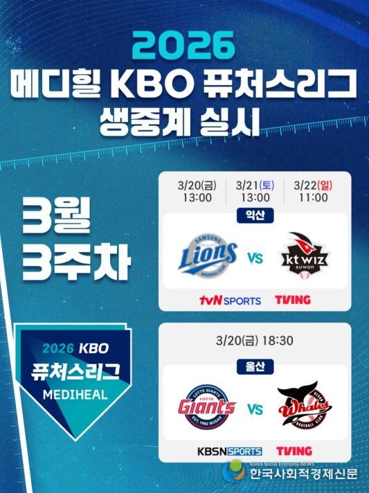 한국사회적경제신문 claire-shin 기자 | KBO는 3월 20일(금) 개막하는 2026 메디힐 KBO 퓨처스리그 경기를 TV 채널 tvN SPORTS, KBSN SPORTS와 OTT 플랫폼 TVING을 통해 생중계 한다.