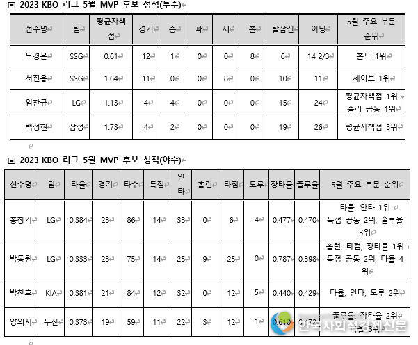 Korea Social Economy News 김은영 기자 | 치열한 선두 경쟁에 힘입어 매진 행진 등 팬들의 응원 경쟁에도 불이 붙은 가운데, 2023 신한은행 SOL KBO 리그 5월 월간 MVP 후보로 총 8명의 선수가 확정됐다. 투수 중에서는 SSG 노경은, 서진용, LG 임찬규, 삼성 백정현이, 타자 중에서는 LG 홍창기, 박동원, KIA 박찬호, 두산 양의지가 이름을 올렸다.