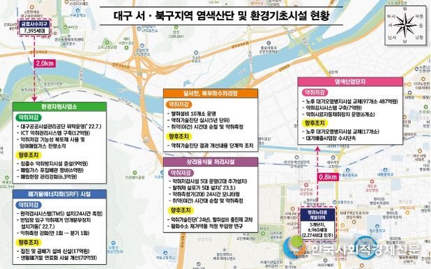 한국환경공단 악취실태 조사 결과를 바탕으로 2019년부터 시범적으로 실시하던 노후 대기오염방지시설 교체사업을 2021년부터 염색산단과 서대구산단 노후 대기오염방지시설을 전면 교체하기 위해 ‘광역단위 노후 대기오염방지시설 설치 사업’을 집중 추진해 100개소 519억 원을 투입하고 2024년까지 사업을 최종 완료할 예정이다.