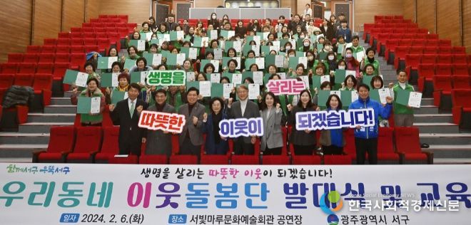 한국 사회적경제신문 김인효 기자 | 광주광역시 서구가 주민들과 함께 촘촘한 복지 안전망 구축에 나선다. 서구는 18개 동에서‘우리동네 이웃돌봄단’82명을 선발하고 6일 서빛마루문예회관에서 발대식을 개최했다.