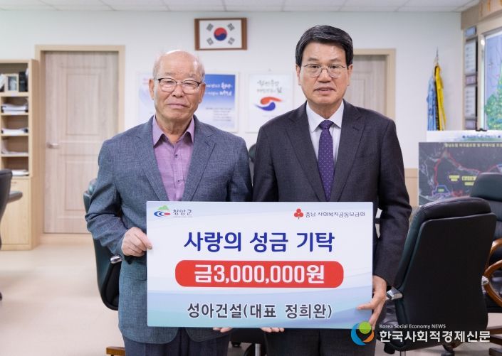 한국 사회적경제신문 김인효 기자 | ㈜성아건설(대표 정희완)이 지난 8일 청양군을 방문해 이웃사랑 성금 300만 원을 기부했다.