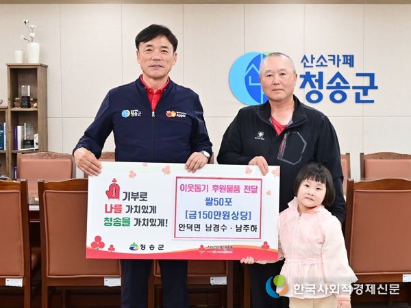 한국 사회적경제신문 김인효 기자 | 청송군는 지난 4월 8일 안덕면 노래1리 (전)이장 남경수씨가 자녀 주하와 함께 150만원상당 쌀 50포를 청송군에 전달했다고 밝혔다.