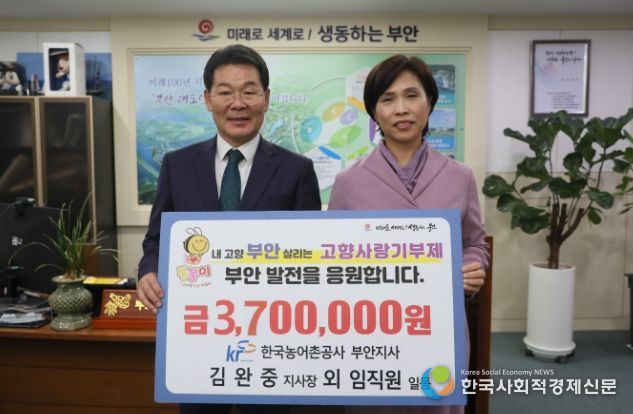 한국 사회적경제신문 김인효 기자 | 부안군은 지난 8일 한국농어촌공사 부안지사 김완중 지사장과 임직원 36명이 고향사랑기부금으로 370만 원을 기탁했다고 밝혔다.