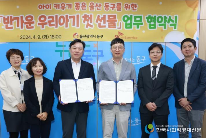 동구는 4월 9일 오후 3시 30분 구청장실에서 김종훈 동구청장과 SK엠앤서비스 기업컨설팅팀 함동훈 팀장 등이 참석한 가운데 원만한 사업 추진을 위한 울산동구-SK엠앤서비스(대표 박정민) 간 ‘반가운 우리아기 첫 선물’ 업무 협약을 체결했다.