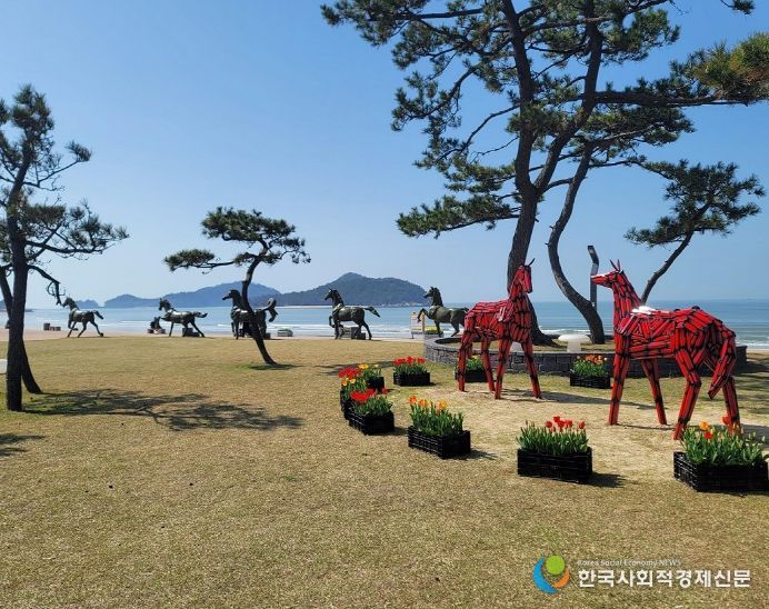 한국 사회적경제신문 김인효 기자 | 폭 200m, 길이 12km의 광활한 모래사장이 펼쳐진 신안의 대광해변에 홍매화를 상징하는 붉은색의 말 조각작품 2점이 지난 3월 6일 설치됐다.