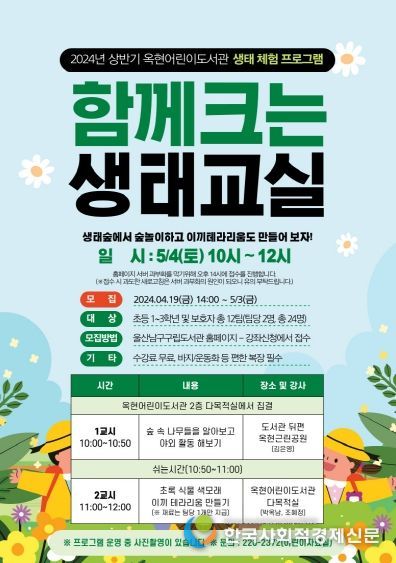 한국 사회적경제신문 김인효 기자 | 울산 남구 옥현어린이도서관은 주변 생태숲을 이용한 체험 프로그램을 통해 지역 어린이들에게 다양한 문화 체험의 기회를 제공하고, 지역 문화 진흥에 이바지하고자 상반기 생태 체험 프로그램을 운영한다고 10일 밝혔다.
