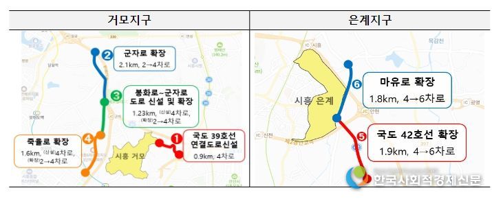 시흥지역 6개 집중투자사업(➊국도 39호선 연결도로 신설, ➋군자로 확장, ➌봉화로~군자로 신설 및 확장, ➍죽율로 확장, ➎국도 42호선 확장, ➏마유로 확장)에 대해 완공 시기를 최대 15개월 단축할 계획이다.
