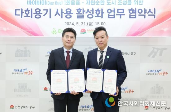 한국사회적경제신문 KSEN 황인규 기자 | 인천시 중구는 기후 위기 대응과 자원 선순환 문화 확산을 도모하고자 ‘㈜다와’와 다회용기 활성화를 위한 협력체계를 구축했다고 3일 밝혔다.