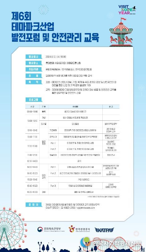 한국사회적경제신문 KSEN 황인규 기자 | 문화체육관광부는 한국테마파크협회와 함께 6월 12일 오전 10시, 롯데호텔(서울, 을지로)에서 ‘제6회 테마파크산업 발전 포럼’을 개최한다. 2019년에 시작한 ‘유원산업 발전 포럼’은 지난 2월 ‘유원시설’ 용어를 ‘테마파크’로 변경하는 '관광진흥법' 개정(2025년 8월 28일 시행 예정)을 계기로 ‘테마파크산업 발전 포럼’이라는 이름으로 바뀌어 처음 열린다. 포럼 주제 역시 확대해 기존 안전관리 중심 논의에서 벗어나 테마파크산업 경쟁력 강화를 위한 방안 전반을 다룬다.
