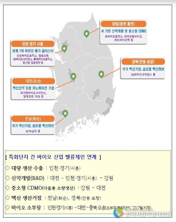 강원(춘천·홍천)은 AI기반의 신약개발과 중소형 CDMO 거점으로 조성한다. AI헬스케어 글로벌혁신특구 등 바이오 인프라와 항체산업, 디지털헬스케어·의료기기 등 주변지역과의 연계·확장을 통해 바이오산업의 발전을 추진한다.
