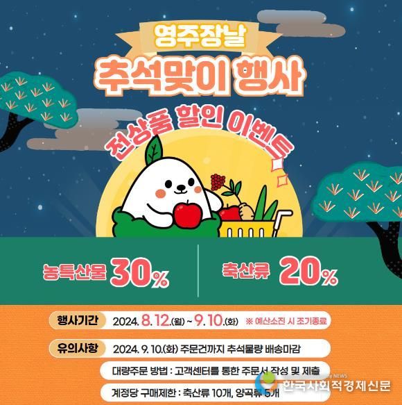 한국사회적경제신문 KSEN 황인규 기자 | 영주시는 오는 12일부터 9월 10일까지 공식 농특산품 온라인 쇼핑몰 ‘영주장날’에서 추석맞이 전 상품 할인 행사를 진행한다.