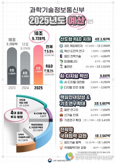 한국사회적경제신문 KSEN 황인규 기자 | 과학기술정보통신부는 2025년도 정부 예산안 및 기금운영계획안에 편성된 과기정통부 예산(안)은 총 19조원으로, 2024년 17.9조원 대비 5.9% 증가한 규모로 편성했다고 밝혔다.