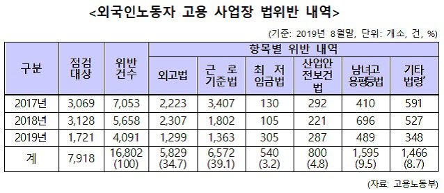 임금체불 외에 노동법 위반도 심각한 것으로 나타났다. 노동부가 2017년부터 3년 간 7918개 외국인 고용 사업장을 점검한 결과 1만6802건의 법 위반 사항이 적발됐다. 근로기준법 위반이 39.1%(6572건)으로 가장 많았고, 외국인근로자고용법 위반 34.7%(5829건), 남녀고용평등법 9.5%(1595건) 순이었다.