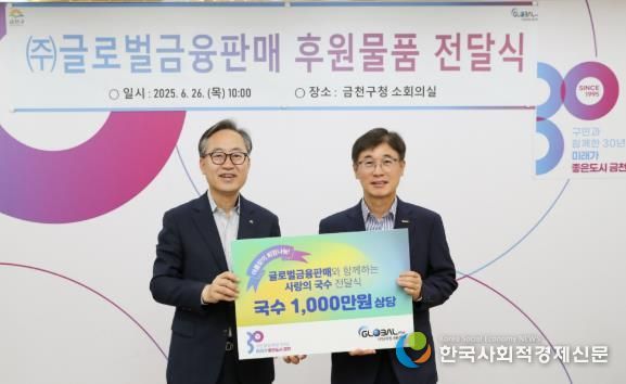 후원품 전달식은 6월 26일 금천구청 소회의실에서 진행됐으며, 유성훈 금천구청장, 김종선 ㈜글로벌금융판매 대표가 참석했다.