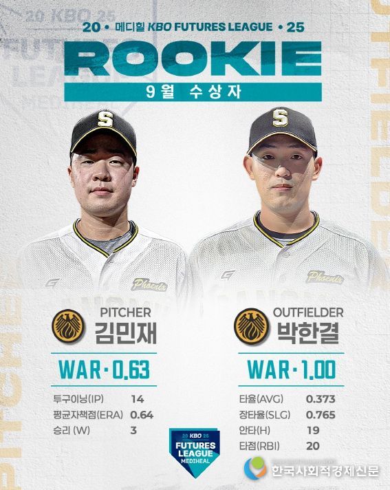 한국사회적경제신문 김은영 기자 | 2025 메디힐 KBO 퓨처스리그의 9월 퓨처스 루키상 수상자로 투수 부문에는 상무 김민재가 WAR 0.63, 타자 부문에는 상무 박한결이 WAR 1.00을 기록하며 각각 선정됐다.