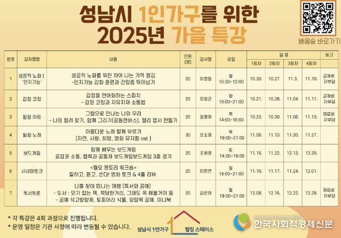 한국사회적경제신문 황인규 기자 | 성남시는 오는 10월 20일부터 12월 29일까지 중원구 하대원동 1인 가구 힐링스페이스에서 총 150명이 참여하는 7개 과목(과목별 20~30명)의 특강을 연다.