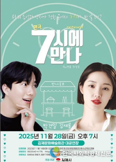 한국사회적경제신문 기자 | 우리 삶에 가장 찬란한 순간 중 하나인 사랑에 대한 추억과 익숙한 노래가 함께 어우러지는 뮤직 드라마 연극 ' 7시에 만나 '가 오는 27일 오후 7시 김제문화예술회관 대공연장에서 펼쳐진다.