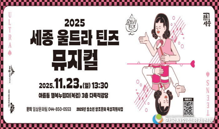 한국사회적경제신문 기자 | 세종시문화관광재단은 11월 23일, 아름동 행복누림터 3층 다목적강당에서 청소년 무대예술 교육 프로그램의 성과를 선보이는 ‘2025 세종 울트라 틴즈 뮤지컬’ 공연을 개최한다. 이번 공연은 약 4개월간의 교육 과정을 통해 성장한 청소년들의 창작 역량을 발표하는 자리다.