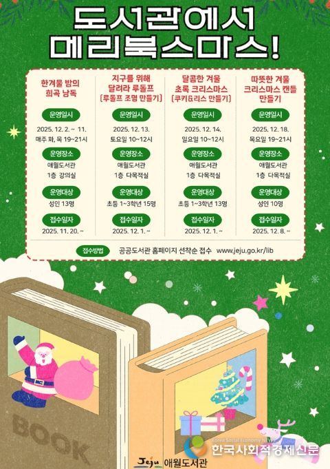 한국사회적경제신문 기자 | 제주시 애월도서관은 겨울을 맞아 지역 주민들이 따뜻하고 풍요로운 연말을 보낼 수 있도록 12월 2일부터 18일까지 ‘도서관에서 메리북스마스!’ 연말 특별 프로그램을 운영한다.