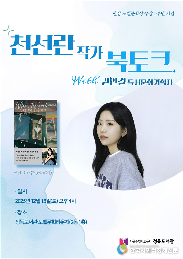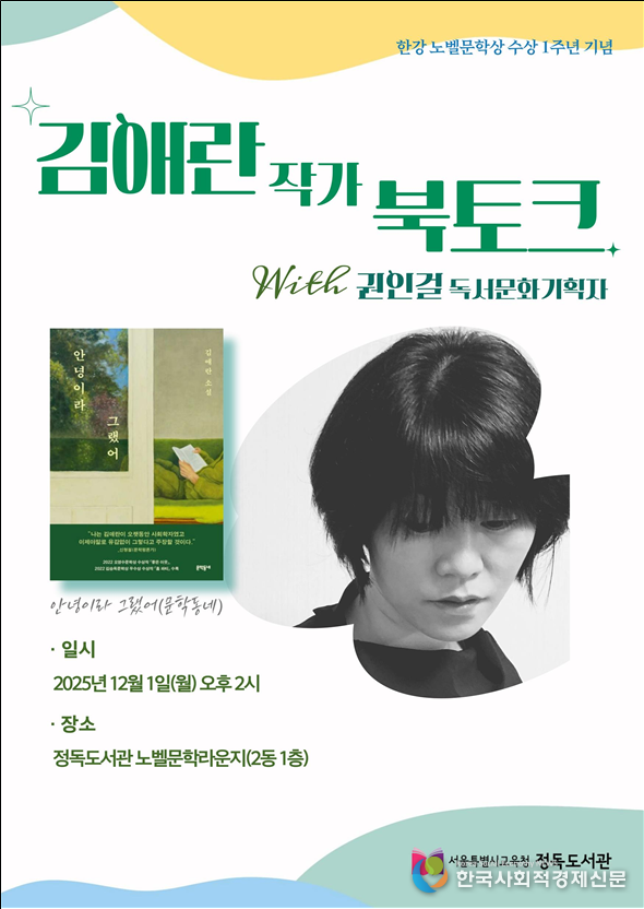 서울특별시교육청 산하 정독도서관이 한강 작가의 노벨문학상 수상 1주년을 기념하며 12월 ‘노벨문학라운지 북토크’를 마련했다. 한국문학을 대표하는 작가들과 시민이 한 공간에서 창작의 깊이를 공유하고, 문학적 감수성을 나누는 자리로 기획됐다. 이번 행사는 문학과 예술을 잇는 공공도서관 프로그램의 새로운 지평을 열었다는 점에서 의미가 있다.