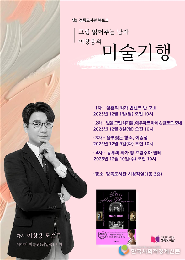 정독도서관은 문학 중심 프로그램과 더불어 예술 감각을 확장하는 강연도 준비했다. 12월 1일부터 10일까지 총 4회에 걸쳐 진행되는 ‘이야기 미술관’은 이창용 도슨트가 고흐, 마네와 모네, 이중섭, 밀레 등 예술가들의 삶과 작품 세계를 풀어내는 방식으로 운영된다. 시청각실에서 열리는 이 프로그램은 시민들이 명화를 기반으로 감상과 사유의 폭을 넓힐 수 있도록 돕는다는 점에서 큰 기대를 모으고 있다.