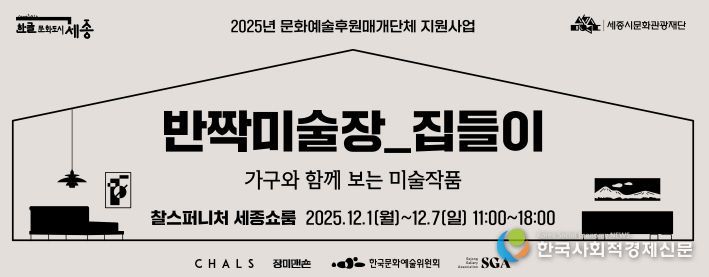 한국사회적경제신문 기자 | 세종시문화관광재단(대표이사 박영국)은 세종화랑협회, (주)찰스와 함께 만드는 협업 전시 ‘반짝 미술장_집들이’를 12월 1일부터 7일까지 찰스퍼니처 세종 쇼룸에서 개최한다고 밝혔다. 이번 전시는 ‘집’을 주제로 한 공간형 전시이자, 지역 시각예술을 생활공간 속에서 자연스럽게 경험하도록 기획된 미술시장형 프로그램이다.