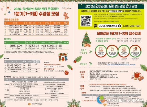 한국사회적경제신문 기자 | 수원시청소년청년재단 권선청소년청년센터는 오는 1월 6일부터 3월 27일까지 지역사회 평생학습 문화강좌 1분기(1~3월) 수강생을 모집한다.