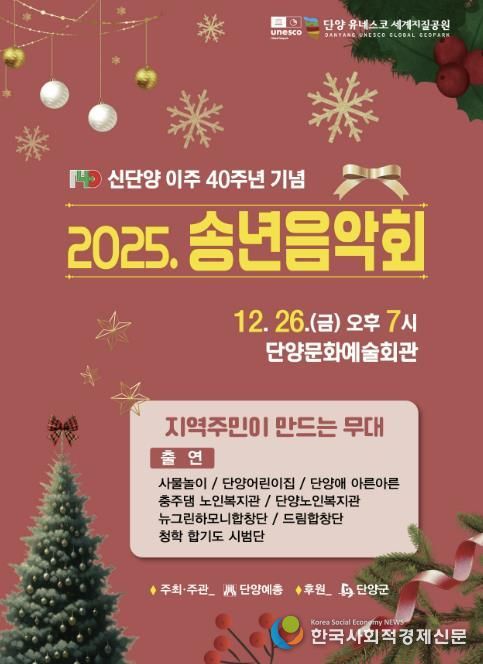 군 관계자는 “신단양 이주 40주년이라는 뜻깊은 해를 맞아 군민이 관객에 머무르지 않고 공연의 주체로 참여하는 송년음악회를 준비했다”며 “이번 무대가 지역 공동체의 결속을 다지고, 희망찬 새해를 함께 맞이하는 계기가 되길 바란다”고 말했다.