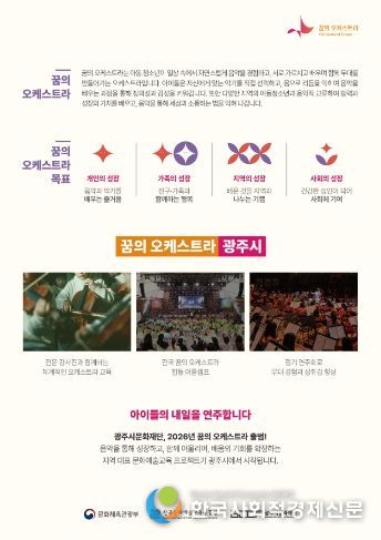 한국사회적경제신문 기자 | (재)광주시문화재단은 문화체육관광부가 주최하고 한국문화예술교육진흥원이 주관하는 ‘2026 꿈의 오케스트라 운영사업’에서 예비 거점기관 단계를 거쳐 최종 신규 거점기관으로 선정됐다고 22일 밝혔다.