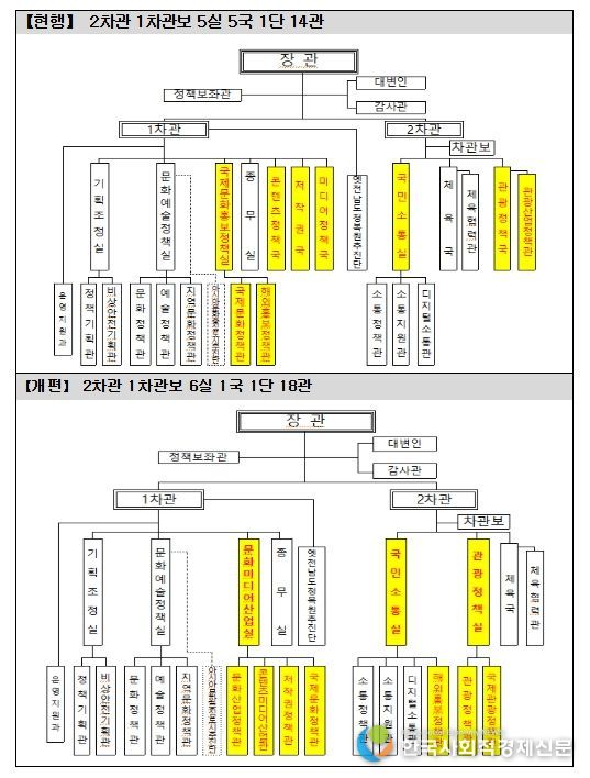 ‘문화미디어산업실’ 내의 콘텐츠정책국과 미디어정책국을 개편해 ‘지식재산(IP)-인력-자금-연구개발(R&D)’ 등 콘텐츠산업의 4대 성장 기반을 중점적으로 지원하는 문화산업정책관을 두고, 미디어·영화·게임·대중음악·출판 등 핵심 분야 지원 기능은 ‘콘텐츠미디어산업관’으로 일원화해 개별 산업 내 쟁점에 대해서도 신속히 대응할 계획이다.