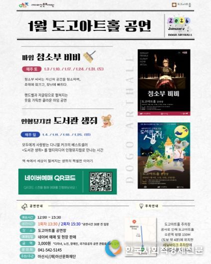 아산문화재단 관계자는 “2026년 새해를 맞아 도고아트홀이 공연과 전시를 함께 즐길 수 있는 생활 문화 공간으로 자리매김하길 기대한다”며 “앞으로도 연령과 세대를 아우르는 다양한 콘텐츠를 통해 시민들의 문화 접근성을 지속적으로 높여 나가겠다”고 말했다.