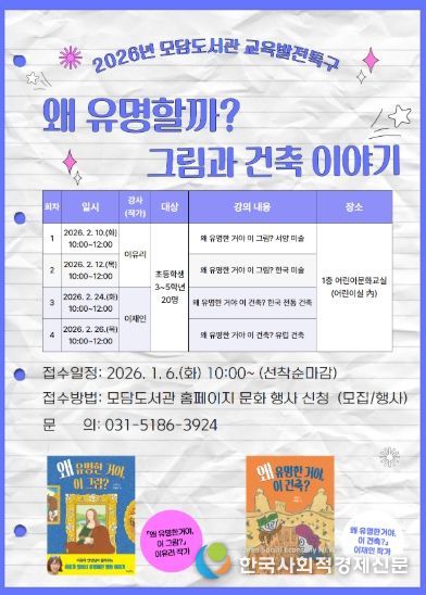 한국사회적경제신문 기자 | 김포시 모담도서관은 어린이를 대상으로 한 문화·예술 융합 프로그램 '왜 유명할까 그림과 건축 이야기'를 2월 10일부터 26일까지 매주 화·목요일 오전 10시부터 12시까지 1층 어린이 문화교실에서 운영한다.
