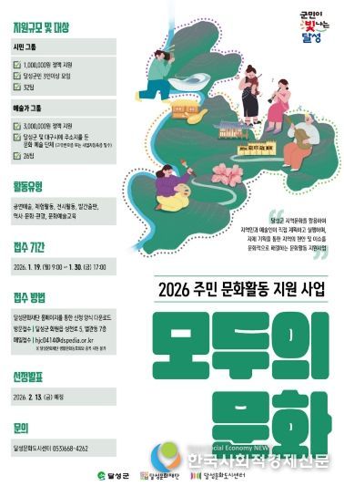한국사회적경제신문 기자 | (재)달성문화재단 달성문화도시센터는 오는 30일까지 지역 주민과 예술가들의 문화활동 지원 사업 ‘모두의 문화’에 참여할 단체를 모집한다고 12일 밝혔다.