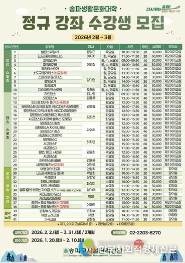 수강 접수 기간은 기존 수강생은 1월 27일까지, 신규 수강생은 1월 29일부터 2월 3일까지 순차 진행된다. 신청은 송파구시설관리공단 홈페이지 온라인 접수 또는 송파문화예술회관 1층 생활문화대학 사무실 방문을 통해 가능하다.