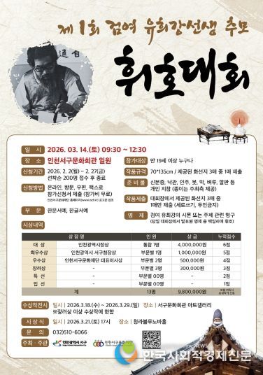 한국사회적경제신문 기자 | 인천서구문화재단은 오는 2월 2일부터 2월 27일까지 ‘제1회 검여 유희강 선생 추모 휘호대회’ 참가자를 모집한다.
