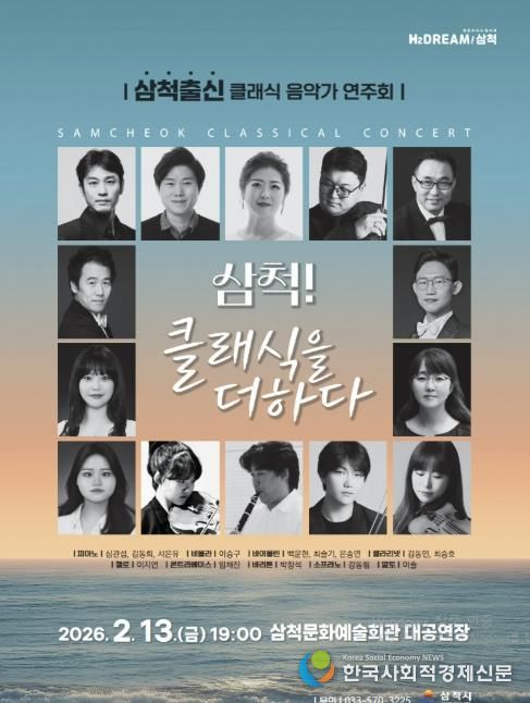 한국사회적경제신문 기자 | 삼척시는 지역 출신 클래식 음악가들을 초청, 수준 높은 공연을 선보이는 '삼척 출신 클래식 음악가 연주회'를 오는 2월 13일 오후 7시 문화예술회관 대공연장에서 개최한다.