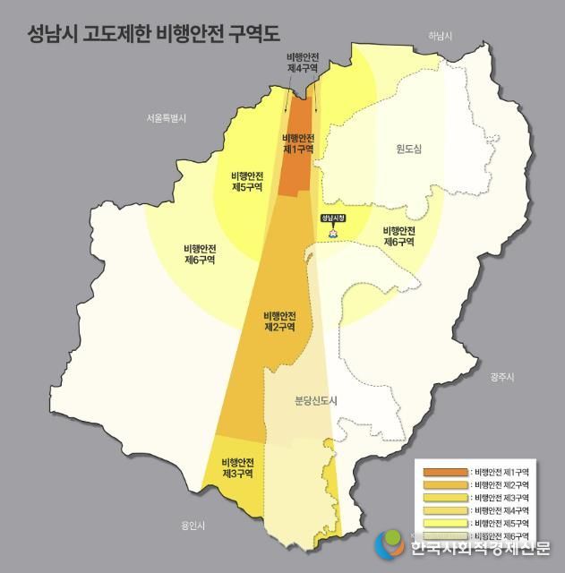 이번 수정안은 비행안전 5·6구역 약 45㎢를 대상으로 한 고도제한 완화 방안 3개 안으로, 태평·신흥·수진·성남·야탑·이매 등 24개 동이 포함된다. 성남시는 전체 면적 141.8㎢ 가운데 약 80㎢가 고도제한 규제 지역으로 묶여 있으며, 서울공항 활주로를 기준으로 비행안전구역이 1구역부터 6구역까지 구분돼 있다.