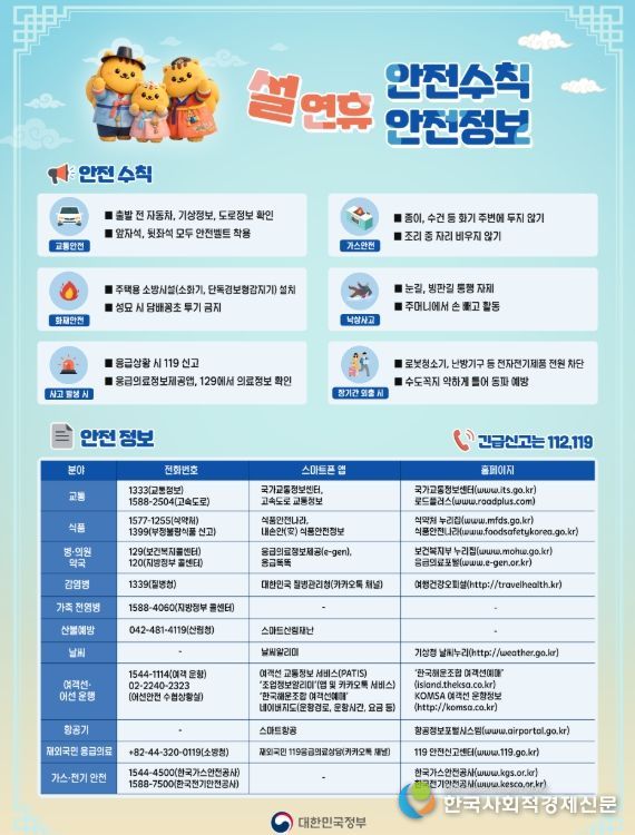 정부는 ▴주요 취약 분야 안전 점검 ▴연휴 기간 24시간 상황관리 ▴안전정보·수칙 대국민 홍보에 중점을 두고 설 명절 국민 피해와 불편을 최소화하는 데 총력을 다할 방침이다.