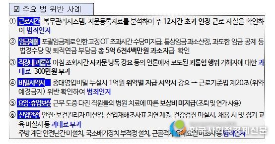 이와 함께 연장·야간·휴일근로 수당 등 임금 미지급 5억 6천4백만원에 대해서도 시정지시했다.