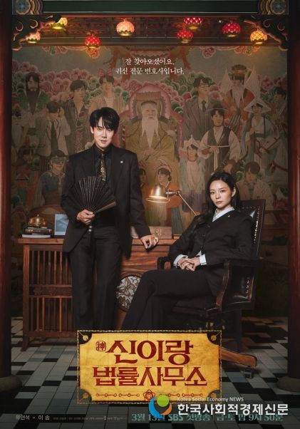 앞서 공개된 티저 포스터에서는 부적이 가득 붙은 벽면과 향로의 연기가 자욱한 옥천빌딩 501호의 ‘신이랑 법률사무소’가 “보이지 않는 진실을 변호합니다”라는 문구를 내세우며 기묘한 세계관의 시작을 알렸다. 그리고 이번 메인 포스터에서는 그 수상한 공간이 보다 선명하게 위용을 드러낸다. 고풍스러운 법률사무소 내부, 그 중심에 자리한 변호사 신이랑(유연석)과 한나현(이솜)의 뒷 배경에 전통 민화풍으로 그려진 신적 존재들과 망자가 차지하고 있는 것. 이곳이 단순한 로펌이 아닌, 보이지 않는 세계와 연결된 장소임을 직관적으로 보여주는 대목이다.