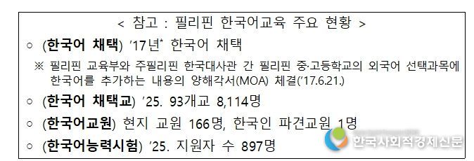 필리핀은 2017년에 현지 정규 교육과정의 외국어 과목으로 한국어를 정식 채택하는 것으로 결정하고, 2018년부터 한국어반을 운영해 왔다. 현재는 90여 개 학교에서 8,000여 명의 학생들이 한국어를 배우고 있다. 이번 양해각서는 한국 교육부가 필리핀 내 한국어 교사들을 위한 집중 연수 과정을 지원하여, 한국어교육 전문성을 높이도록 하는 내용이 핵심이다.