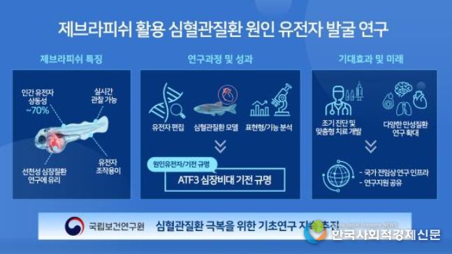 국립보건연구원은 제브라피쉬 동물모델을 활용해 유전성 심혈관질환의 원인이 되는 유전자를 찾고, 질환이 생기는 과정을 밝히는 연구를 수행하고 있다.