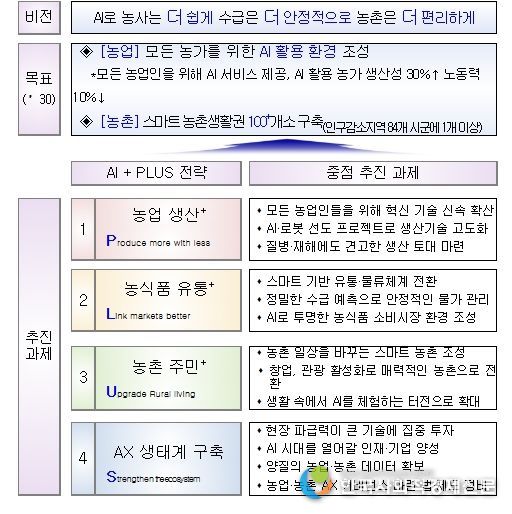 이번 전략은 ‘인공지능(AI)으로 농사는 더 쉽게, 수급은 더 안정적으로, 농촌은 더 편리하게’를 비전으로 설정하고, 이를 실현하기 위해 ① 농업 생산성 혁신, ② 농식품 유통구조 고도화, ③ 농촌 주민 삶의 질 개선, ④ 인공지능 전환(AX) 생태계 기반 조성 등 4대 분야를 설정하고 13대 과제를 중점적으로 추진할 계획이다.