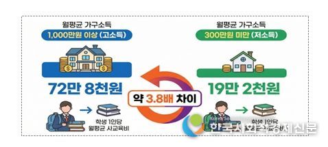 전국 가구 소득별 사교육비를 분석한 결과, 월평균 가구소득이 1,000만원 이상인 경우 학생 1인당 월평균 사교육비는 72만 8천원인 반면, 300만원 미만인 경우 19만 2천원으로 나타났다. 소득 구간에 따라 사교육비 부담이 약 3.8배 차이 나는 것으로 확인됐다.