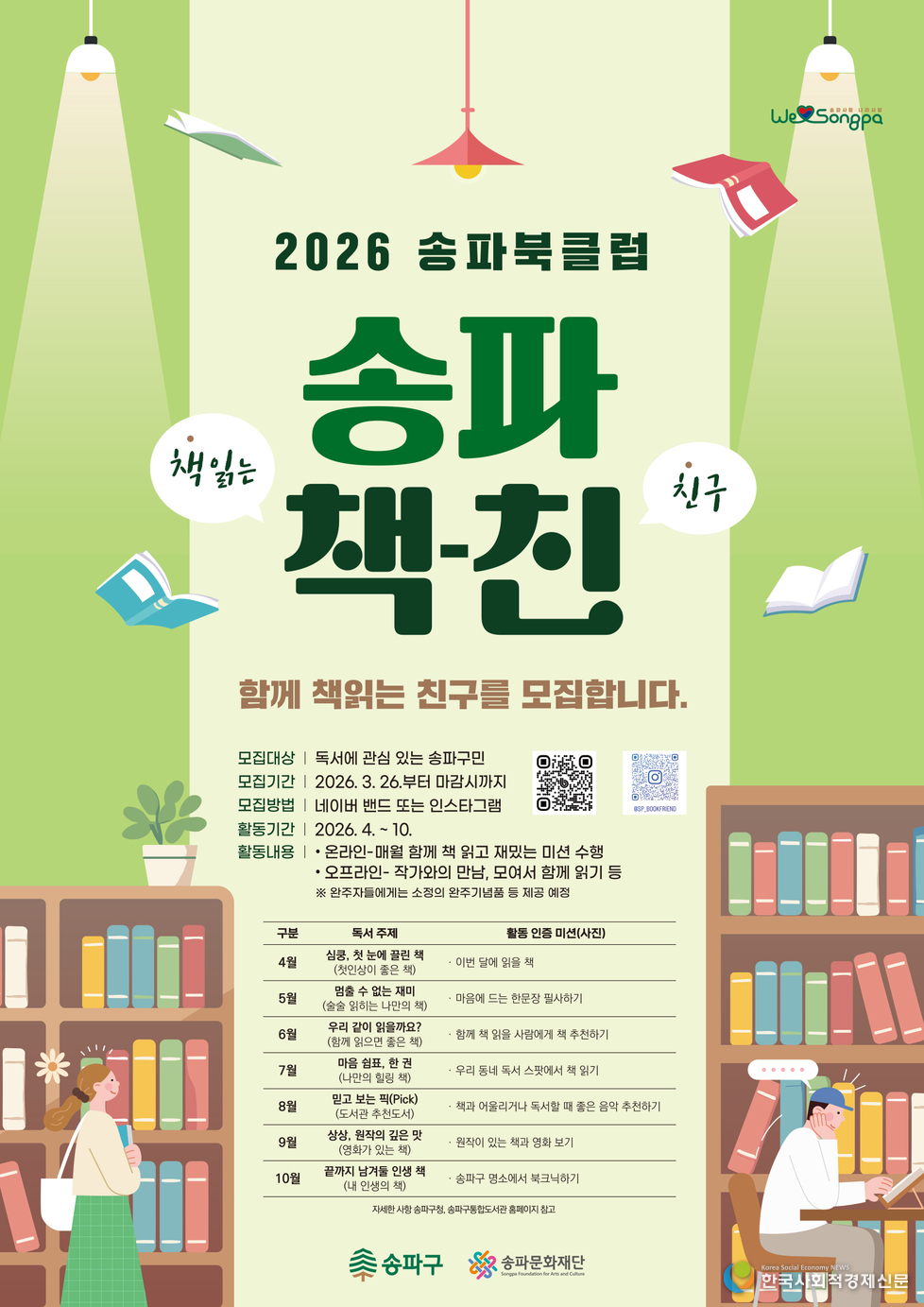 서울 송파구가 독서를 일상 속 문화로 끌어올리기 위한 새로운 실험에 나섰다. 구는 4월부터 10월까지 7개월간 온·오프라인을 결합한 참여형 프로그램 ‘2026 송파북클럽-송파 책-친’을 운영한다고 밝혔다.