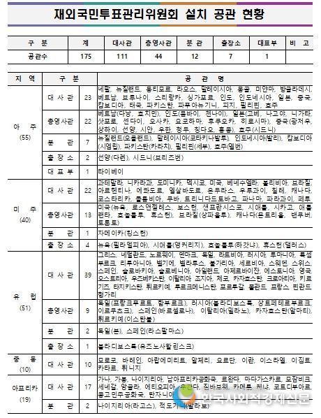 전쟁․폭동 등으로 인해 주재국 정세가 불안한 ▲주아프가니스탄이슬람공화국대사관 ▲주우크라이나대사관 ▲주레바논공화국대사관 ▲주리비아대사관 ▲주사우디아라비아왕국대사관 ▲주젯다총영사관 ▲주두바이총영사관 ▲주예멘공화국대사관 ▲주오만왕국대사관 ▲주이라크공화국대사관 ▲주이라크공화국아르빌분관 ▲주쿠웨이트국대사관 ▲주수단공화국대사관 등 13개 공관에는 재외국민투표관리위원회를 설치하지 않는다.
