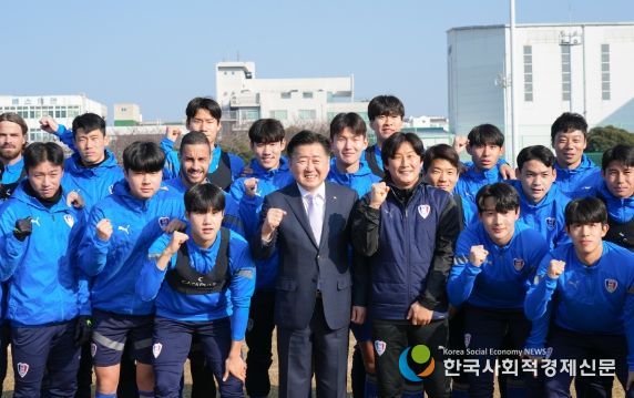 오영훈 지사는 7일 오후 제주시 애향운동장에서 전지훈련을 하는 K-리그 대표구단인 수원삼성블루윙즈 선수와 관계자들을 만나 환영 인사를 전했다.