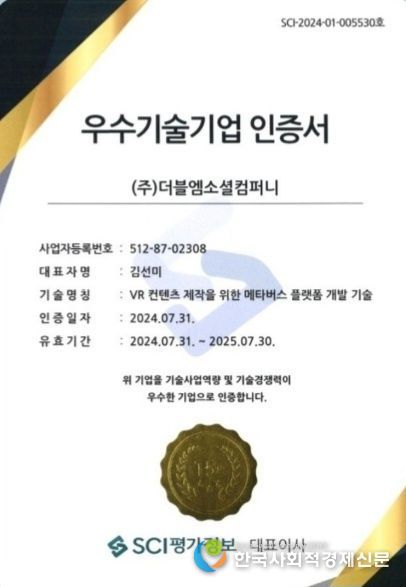 김선미 대표는 "이번 우수기술기업 인증은 당사의 메타버스 플랫폼 기술력과 성장 가능성을 공식적으로 인정받은 성과"라며, "앞으로도 헬스케어와 과학수사 분야에서 VR기술을 선도하며, 더 나은 기술 경쟁력을 확보해 나가겠다"고 밝혔다.