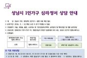 한국사회적경제신문 황인규 기자 | 성남시는 우울감이나 외로움, 불안감, 스트레스로 어려움을 겪는 1인 가구에 전문적인 심리·정서 상담을 지원한다고 5일 밝혔다. 이를 위해 최근 공모로 선정한 6곳 전문상담센터와 1인 가구 심리·정서 상담 수행에 관한 업무 협약을 했다. 협약한 상담센터는 △엠브레스 마인드 심리상담센터(분당구 구미동 소재) △온새미 심리상담센터(분당구 금곡동) △심리상담연구소 사람과 사람 위례점(수정구 창곡동) △㈜분당심리상담센터 아이엠미(분당구 야탑동) △속편한 심리상담센터(수정구 창곡동) △㈜마음꼭 차심리상담센터(분당구 야탑동)다. 이들 전문상담센터 이용 신청은 성남시 1인가구 힐링 스페이스(중원구 둔촌대로 100, 4층, ☏031-729-1756~9)나 거주지 동 행정복지센터 등에서 하면 된다. 성남시는 전문상담센터에서의 1인 가구 심리·정서 상담 지원을 위해 올해 5000만원의 사업비를 투입한다. 상담 지원 횟수는 최대 12회다. 1~8회 상담은 성남시가 비용(회당 4만~6만원)을 지원해 무료다. 나머지 9~12회 상담은 비용의 10%(40